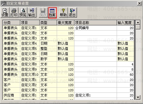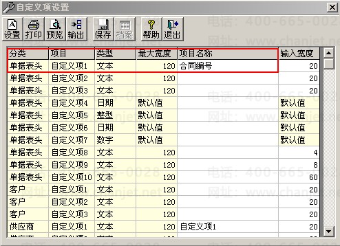 1、依次点击“基础设置”-“自定义项”,在单据表头-自定义项1里输入项目名称“合同编号”;