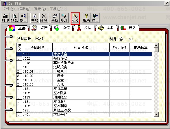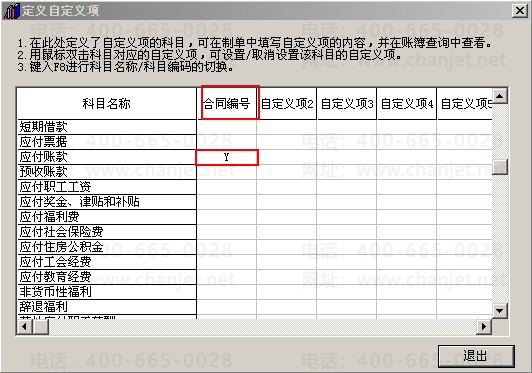 2、再依次点击“基础设置”-“财务”-“会计科目”-“定义”,点击“应付账款(挂了供应商往来辅助核算)”的合同编号列出现“Y”的标志;