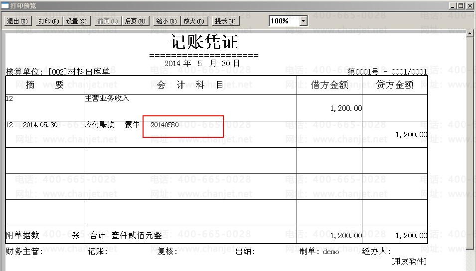 5、预览该凭证可以看到“合同编号”显示在“应付账款”科目栏里。