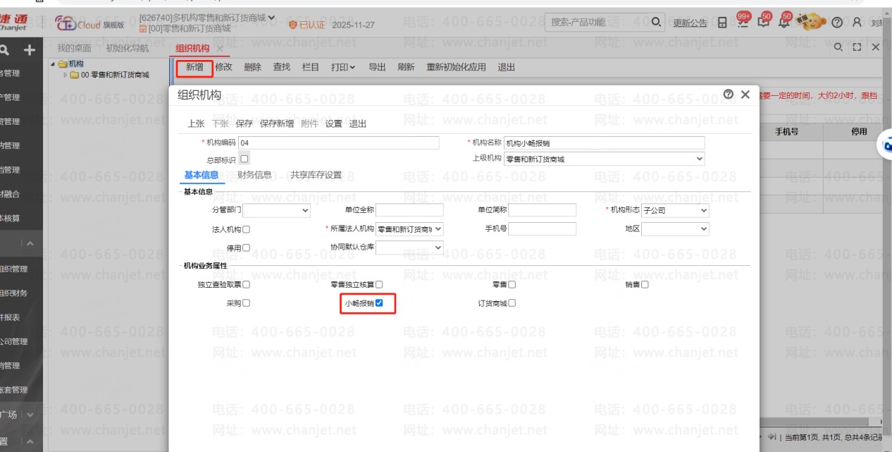 1、总部新建机构时,机构业务属性里勾选【小畅报销】