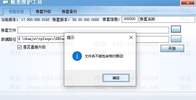 用户在使用T+账套维护工恢复账套时提示:“文件名不能包含相对路径”是什么原因?如何处理?