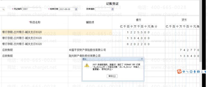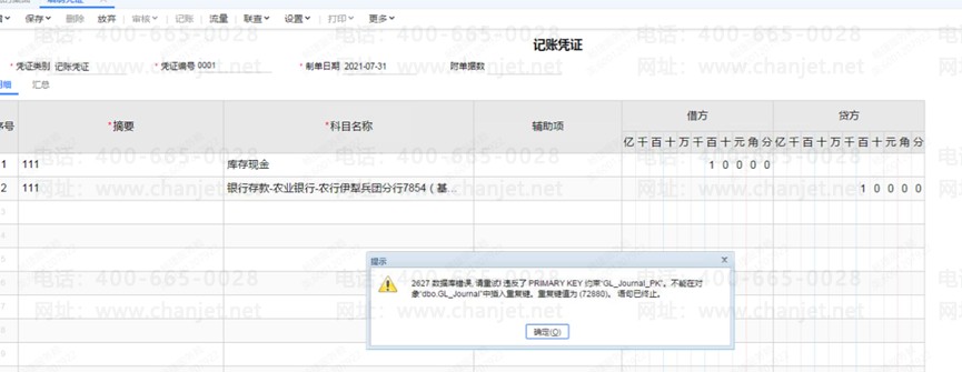 3.情况二:填制凭证,保存时2627数据库错误,请重试!违反了PRIMARY