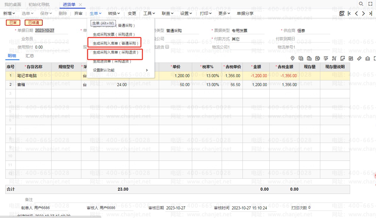进货单流转生成两张入库单,点生单—生成采购入库单(普通采购)和生成采购入库单(采购退货)