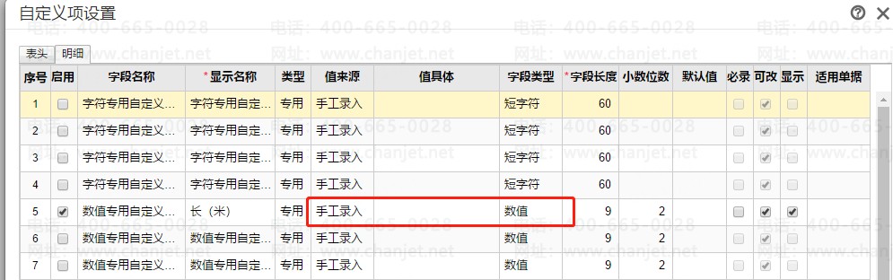 2、为单据设置一个明细的数值自定义项,值来源为“手工录入”,显示名称设置为“长(米)”