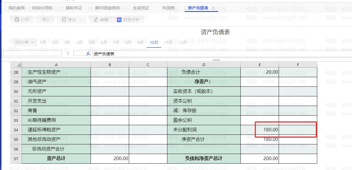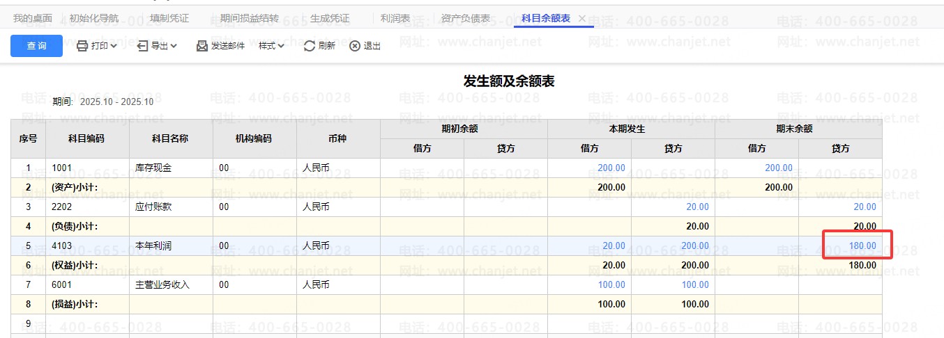 1:先检查资产负债表里面的本年利润的数据是不是和余额表数据一样,先判断资产负债表有没有错误,如果资产负债表不正确检查报表公式以及重新计算看看,在下图可以看到期末余额就是180,和资产负债表一致说明资产负债表没有问题,这个时候可以判断是利润表那边取数不正确