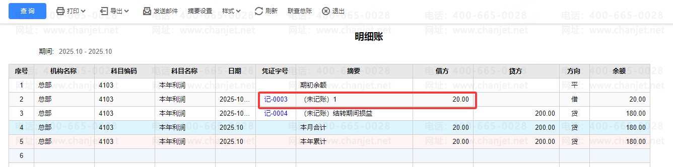 3:重新计算之后发现还是对不上,这个时候怀疑可能是单独使用这个本年利润科目做账导致对不上,我们可以在总账下面的明细账查询本年利润科目明细账,查看对应科目的发生,可以看到确实是使用本利润科目做账,导致有一个差额,差额也是可以对上的。删除对应的凭证就可以保证勾稽关系正确或者是修改一下对应凭证的科目,不要使用本年利润科目单独做账。