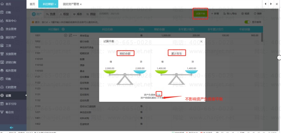 1.提示【期初资产≠负债及所有者权益,请到【科目期初】调整期初数据】