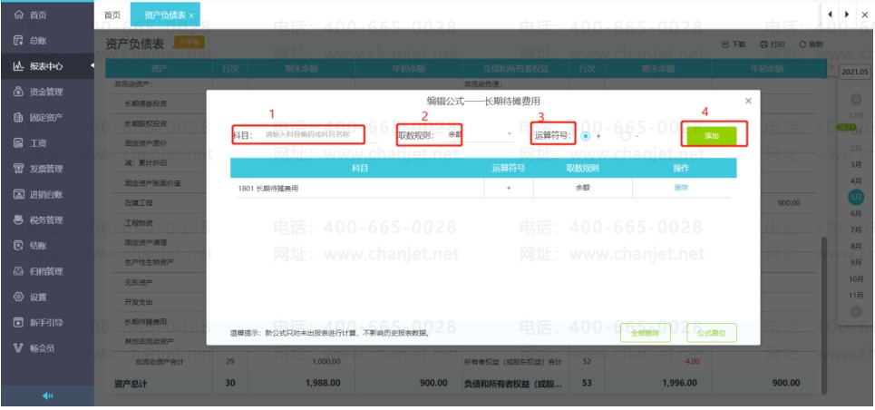 例如增加了【待摊费用】科目,确认性质是长期待摊费用,可以添加进【长期待摊费用】内取值,点击【长期待摊费用】FX按钮,选择【长期待摊费用】科目添加即可: