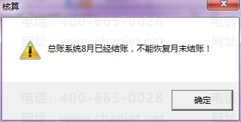 核算模块取消月结时提示:“总账系统8月份已结账,不能恢复月末结账”。如图: