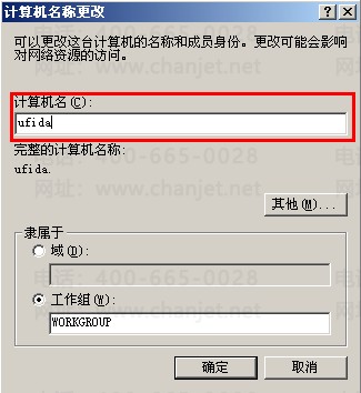 2、在计算机名称下输入计算机名(注意:8位以内的英文字母,如ufida,cw,admin等都可以,但千万不要包含特殊符号,中文等),修改好后点击“确定”按钮。如下图所示:
