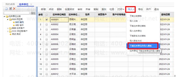 信息编辑完毕后再打开【往来单位】界面点击表头【导入】-【往来单位列导入】选择模板进行导入:
