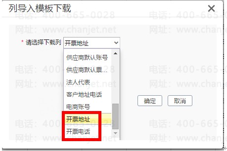 进入【往来单位】界面后点击表头【导入】-【下载往来单位列导入模板】分别选择【开票地址】和【开票电话】下载模板: