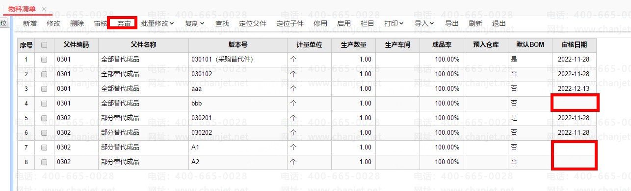 再进入【基础设置】-【物料清单】将需要启用替代的BOM先弃审(不弃审批量修改会提示修改失败),审核日期空白表示物料清单是未审状态: