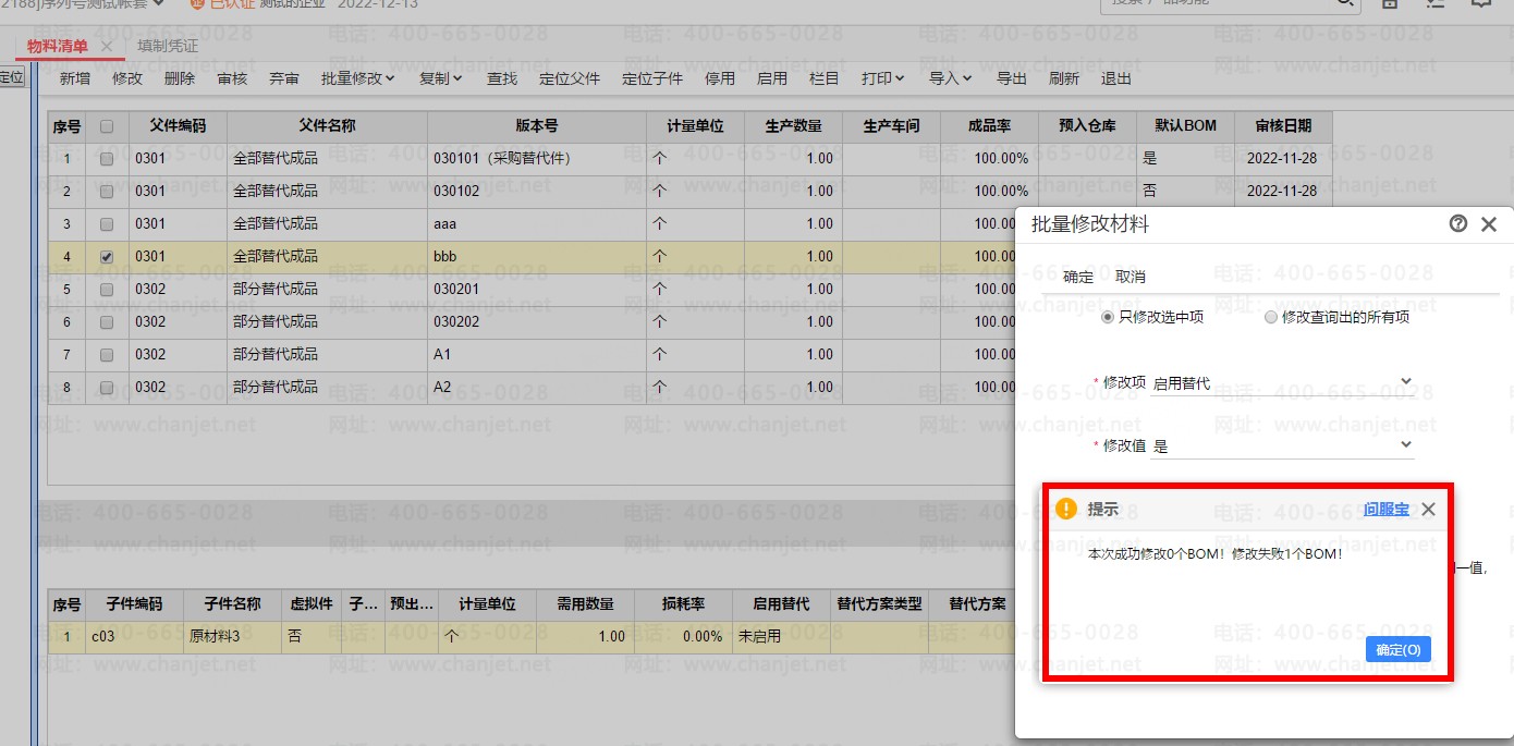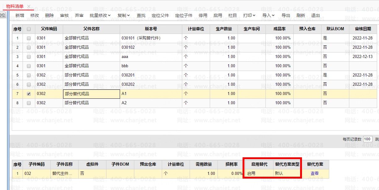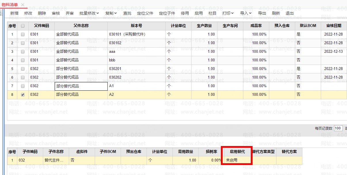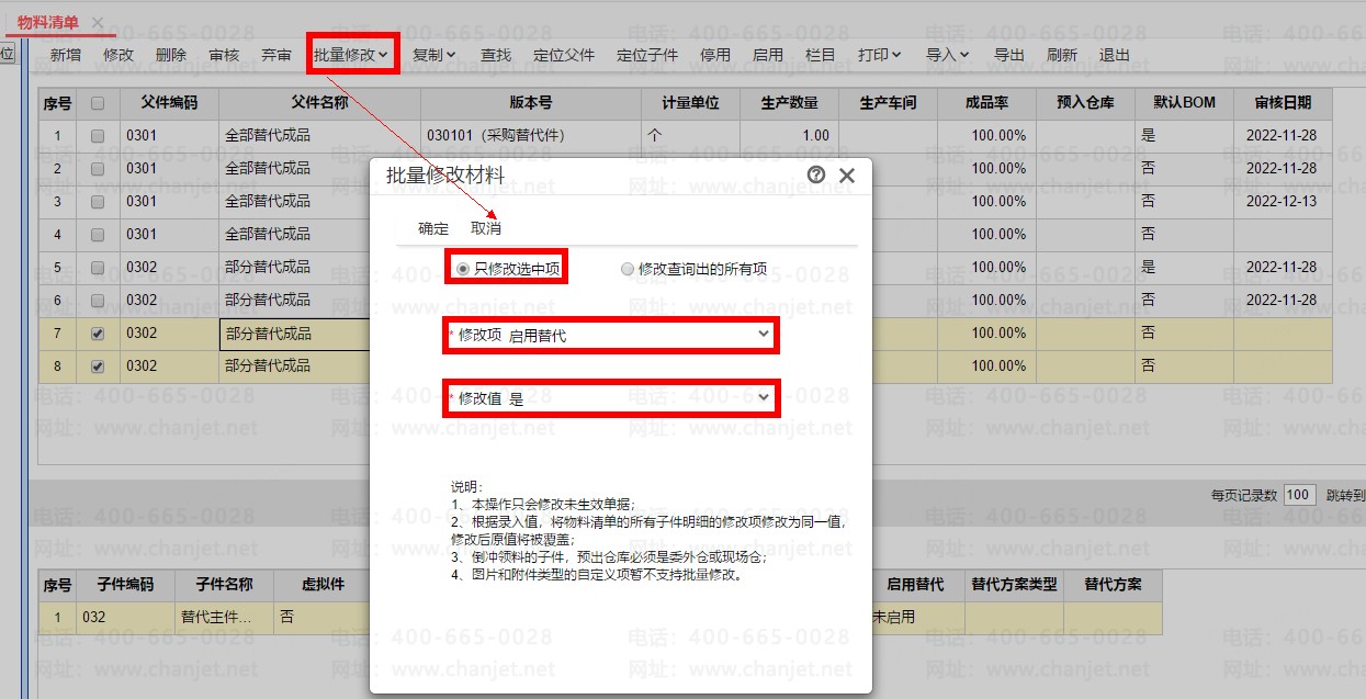 弃审后再选择需要修改的BOM,点击表头的【批量修改-批量修改材料】,如此时需要批量修改父件0302版本号为A1和A2的物料清单启用替代方案:
