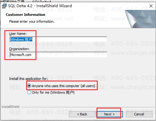 3、输入对应用户和组织名称,可以直接填admin或者别的名称,这个名称没有影响,但是要输入,不影响安装,下面选择all users