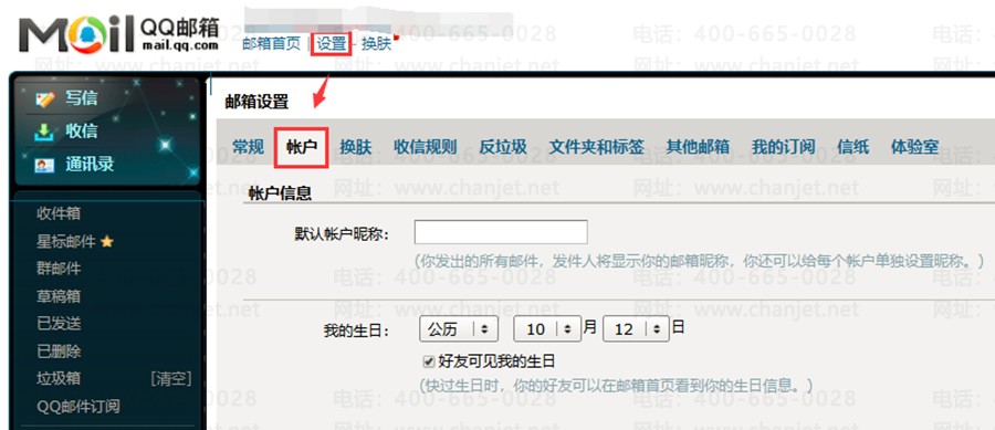 6、若发送邮件的邮箱为QQ邮箱,首先登录邮箱,在邮箱首界面点击上方菜单栏的【设置】,选择【账户】页签,找到【POP3/SMTP服务】点击【开启】按钮,若有设置密保信息等,需要根据提示信息进行验证才能获取【授权码】信息。