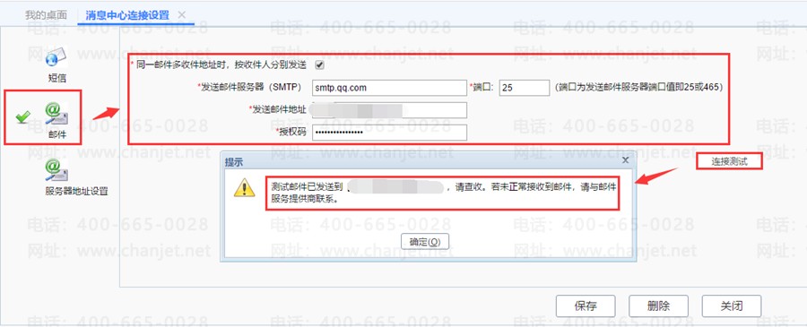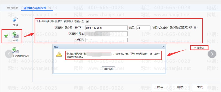 5、返回软件设置界面,在【消息中心连接设置】中维护【发送邮件服务器(SMTP)】为smtp.163.com,【发送邮件地址】为自己的邮箱地址,若同一邮件有多人接收,可勾选【同一邮件多收件地址时,按收件人分别发送】,【授权码】为163邮箱中获取的客户端授权密码,【端口】一般默认为25或465,最后可点击【连接测试】,若测试成功,则当前邮箱会接收到一封测试邮件。