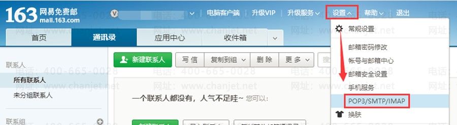 2、若发送邮件的邮箱为163邮箱,首先登录邮箱,在邮箱首界面点击上方菜单栏的【设置】,选择【POP3/SMTP/IMAP】。