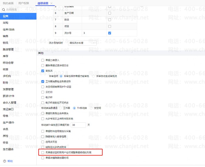 3、系统管理-选项设置的公共页签下将无单据设置权限用户也可调整单据明细的列宽选项取消勾选