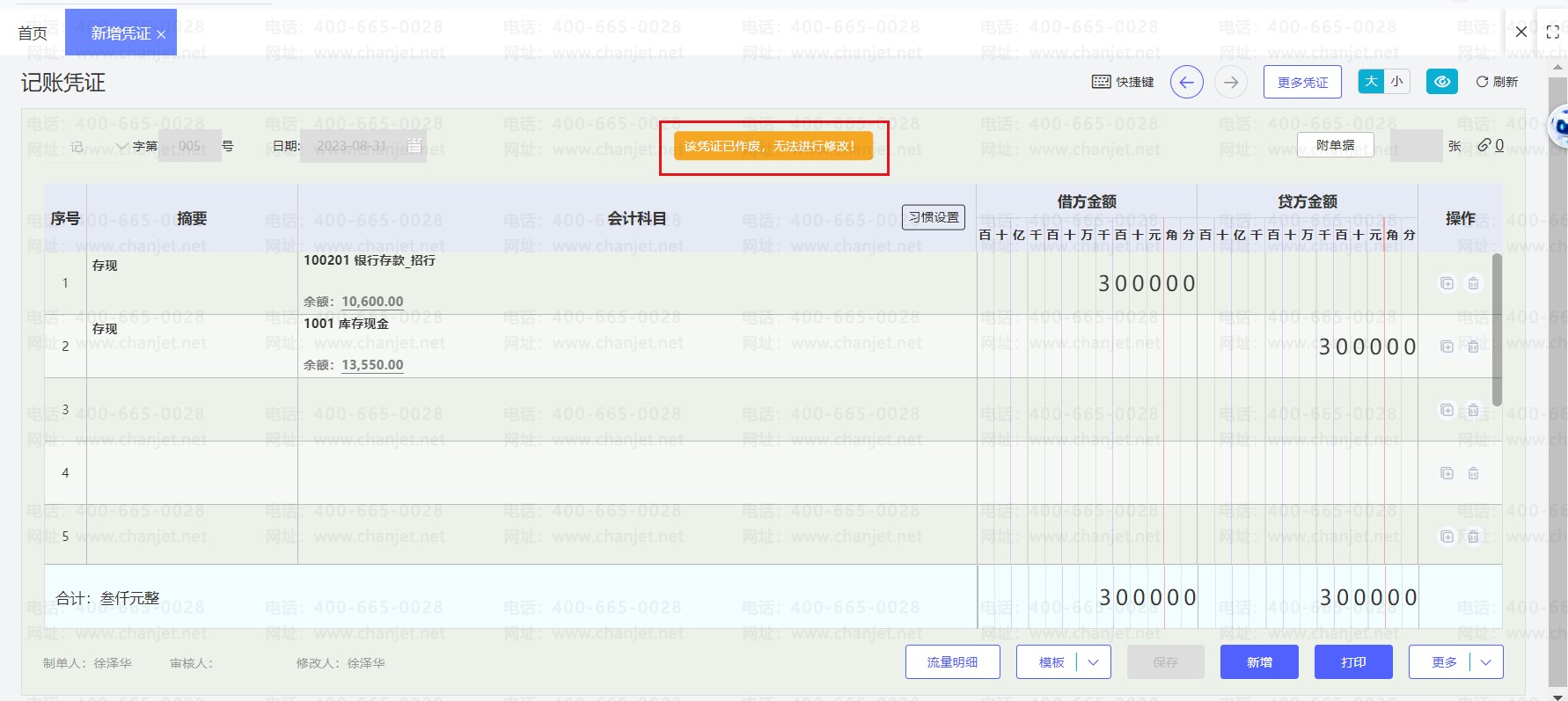 4、显示【该凭证已作废,无法进行修改!】