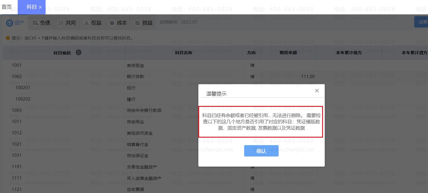 注意:若科目已经使用有数据的情况下,科目无法进行删除。