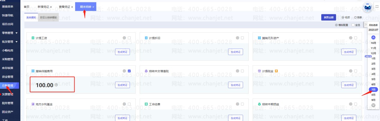 2.点击【总账管理】—【期末结转】,选到9月份(下个月),点击【测算金额】,可查看生成的摊销凭证,如下图,图中:1、长期待摊费用27600.00元,取的是9月份余额表上长期待摊费用科目的借方余额,2、上期待摊费用2400.00元,取的是8月份长期待摊费用科目的贷方发生额