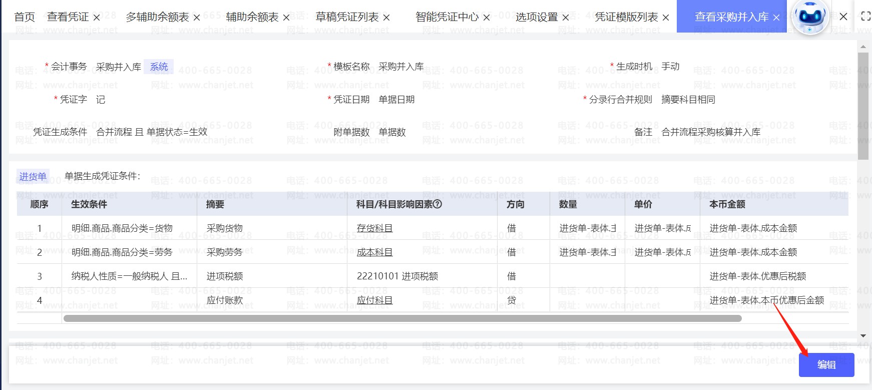 1.点击【总账管理】-【智能凭证中心】-【凭证配置】,点击放大镜进入到查看界面,点击右下角的【编辑】,生成实际改成:自动,在点击【保存】