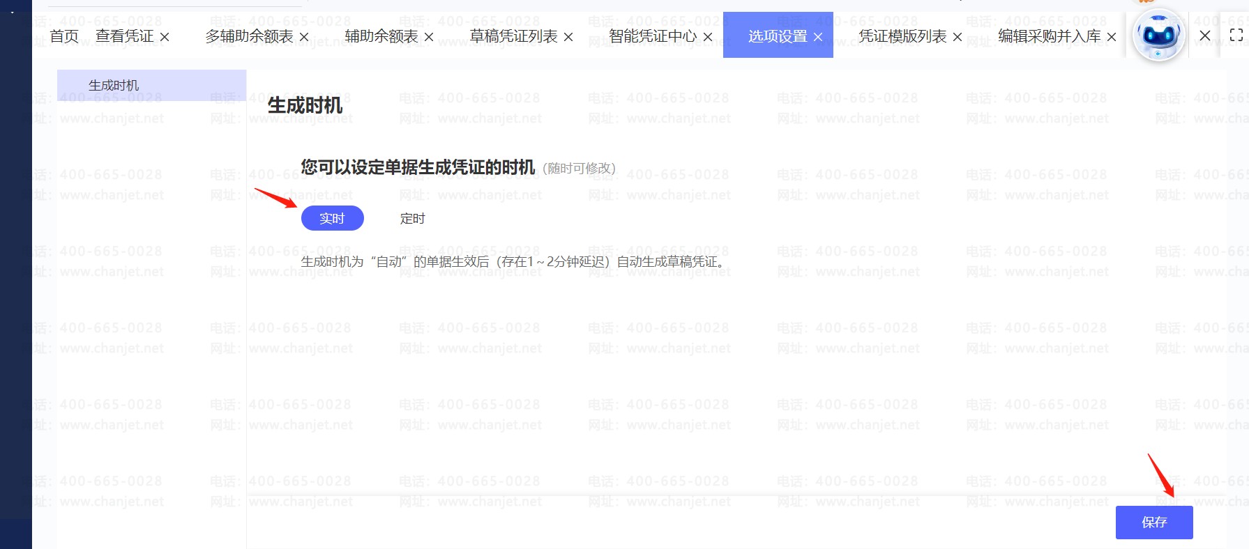 2.点击【总账管理】-【智能凭证中心】-【选项设置】,您可以设定单据生成凭证的时机,改成:实时,保存