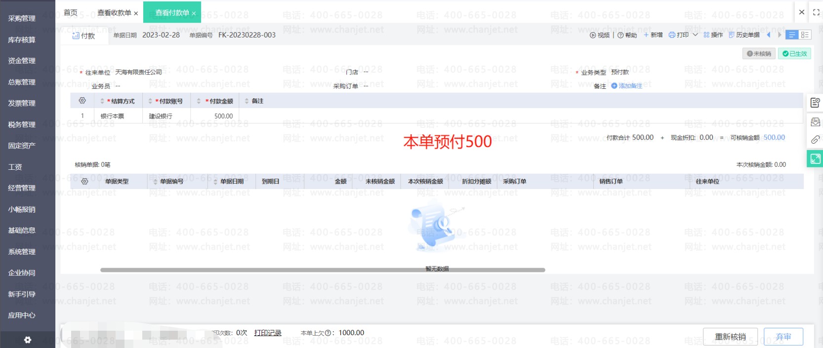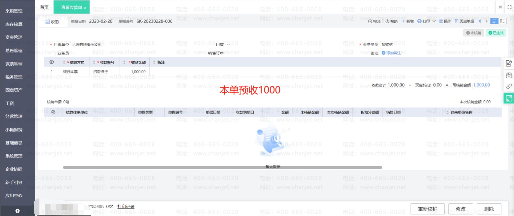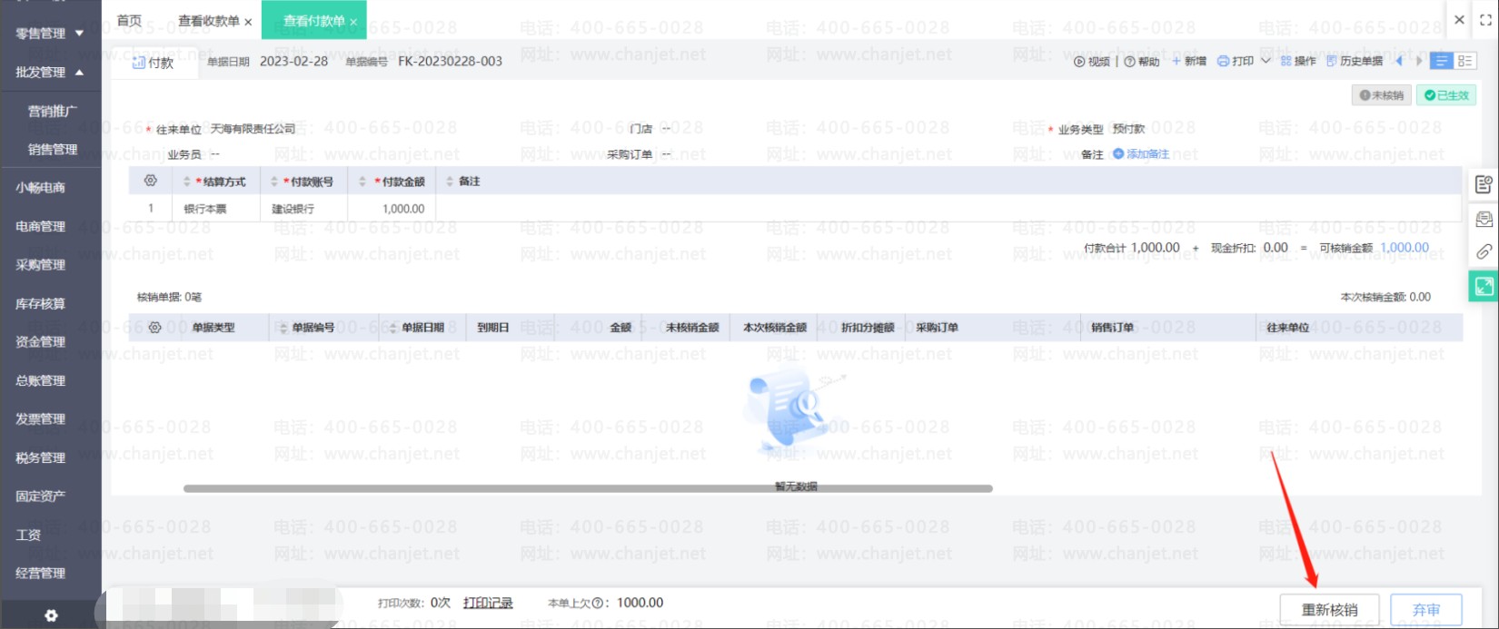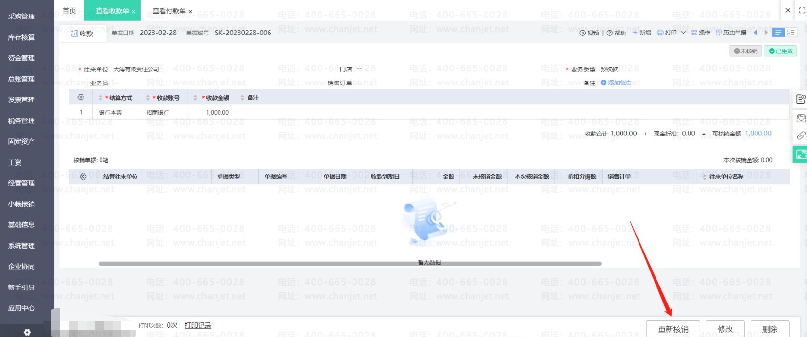 预收款单和预付款单核销之后,如果发现核销有误则需要取消核销。