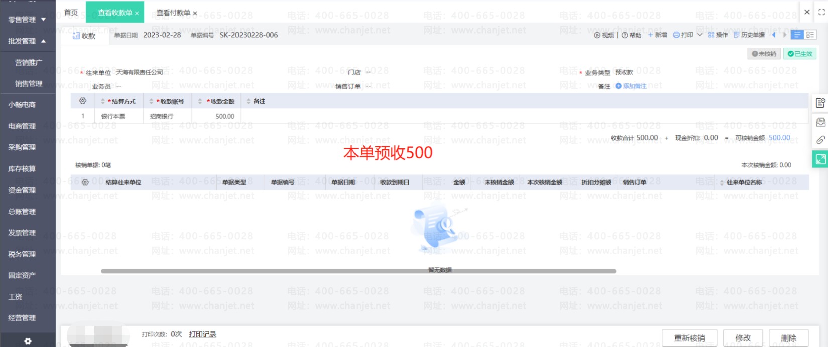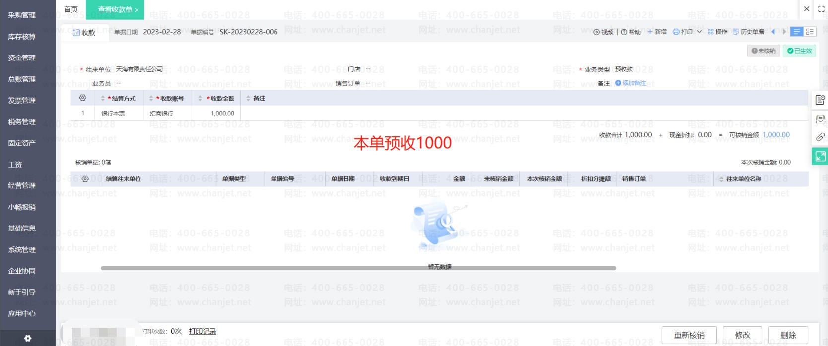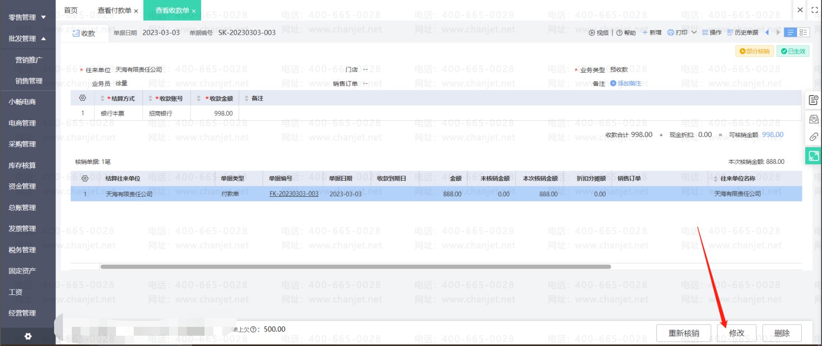 预收款单和预付款单核销之后,如果发现预收或者预付单据内容有误,则需要对单据进行修改操作。
