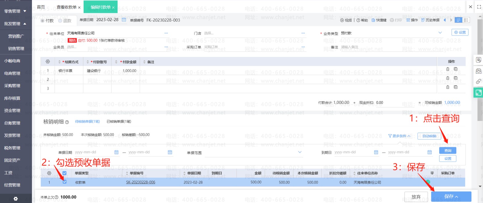 ② 需要冲销掉预收金额,剩余预付进行退款操作