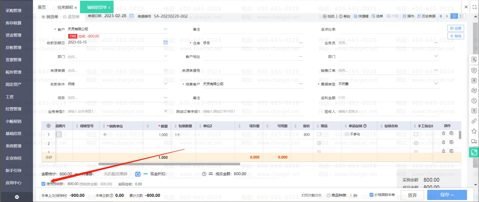 在销货单上勾选使用预收款