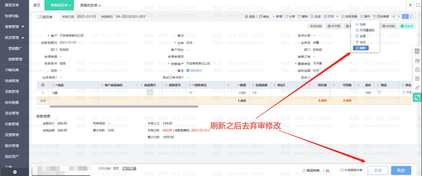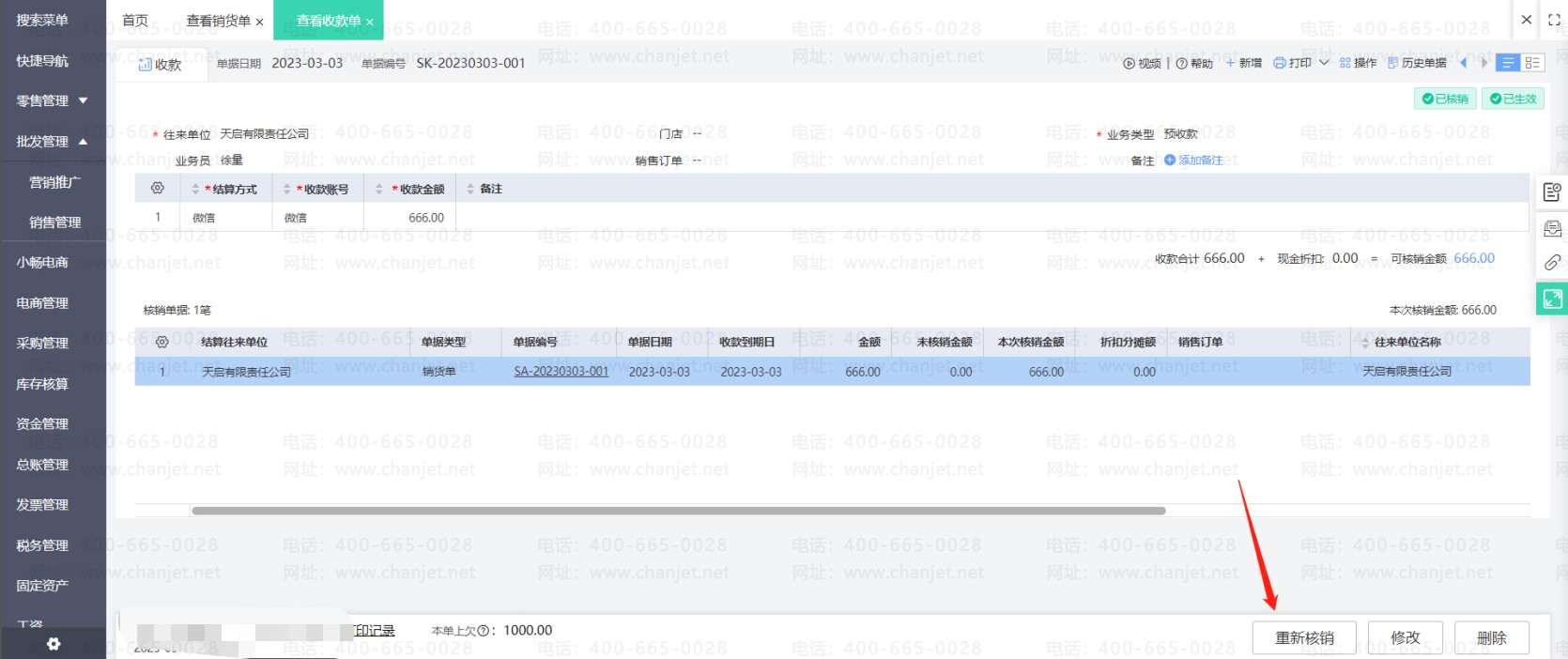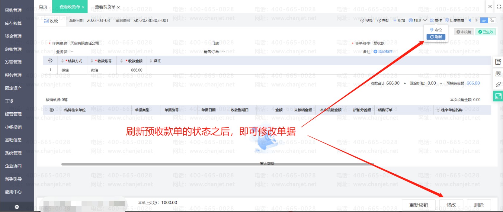 在预收款单上点击重新核销,取消核销明细中销货单的勾选,然后重新保存预收款单。回到销货单上刷新销货单的状态即可操作修改单据。