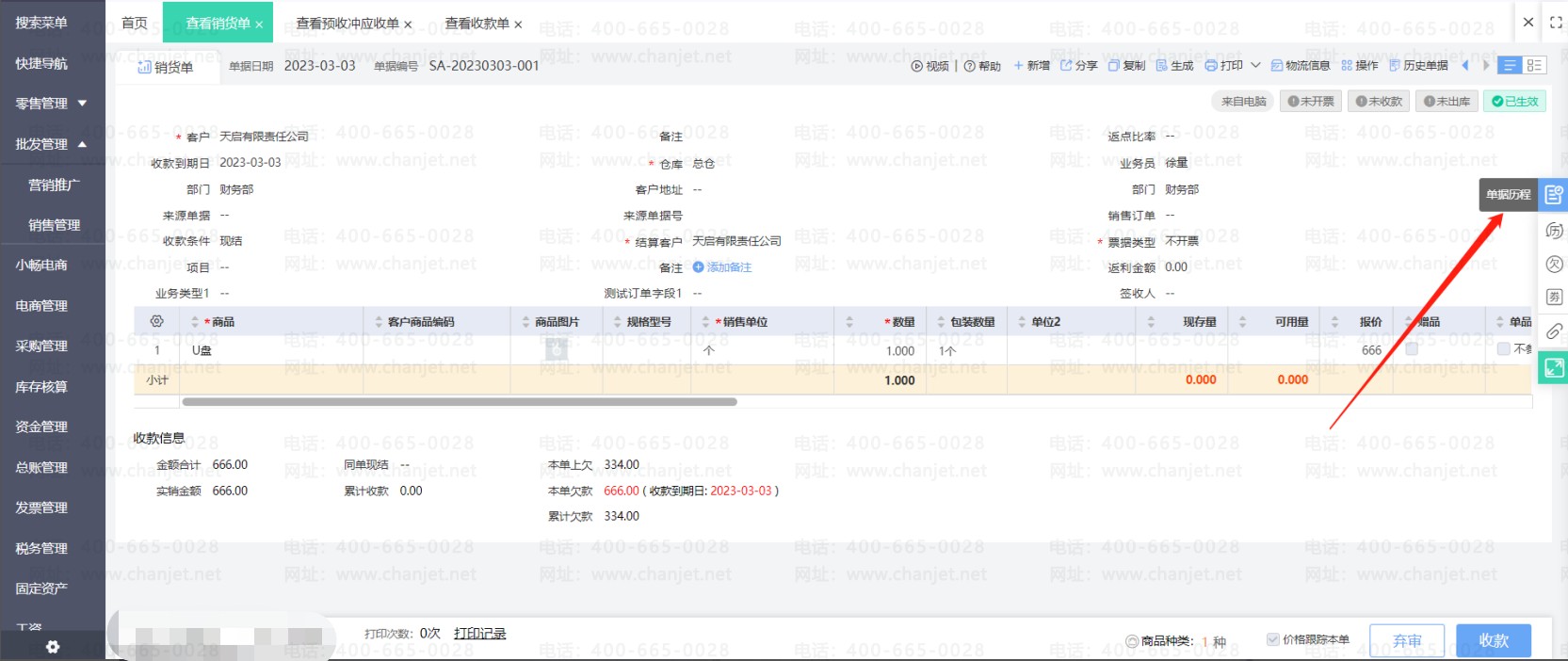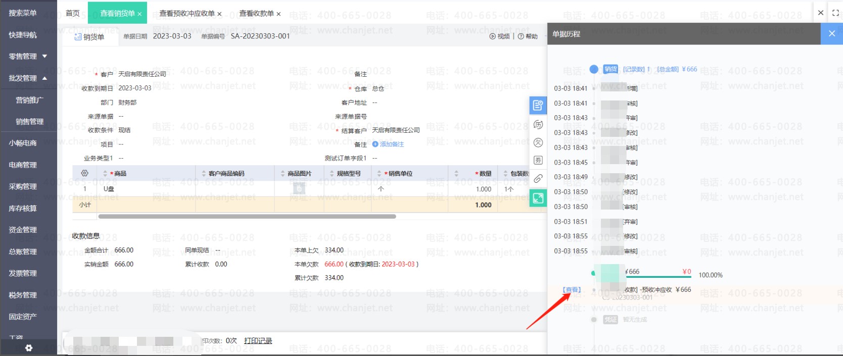 可以在销货单或者预收款单的单据历程中查询到结算的记录,点击查看结算记录可以穿透到预收冲应收单的详情界面,直接点击右下角的删除按钮删除预收冲应收单。之后刷新要修改单据的状态就可以操作修改了。