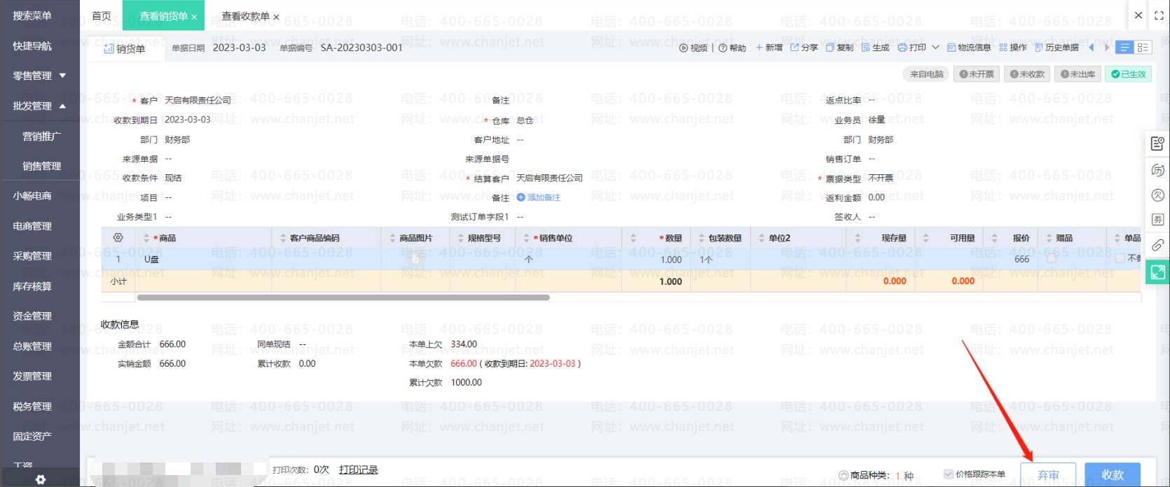 点击修改销货单(如果销货单有审核步骤要先弃审再修改),然后取消使用预收款的勾选,重新保存销货单后即可取消核销。然后刷新预收款单状态就可以修改单据了。