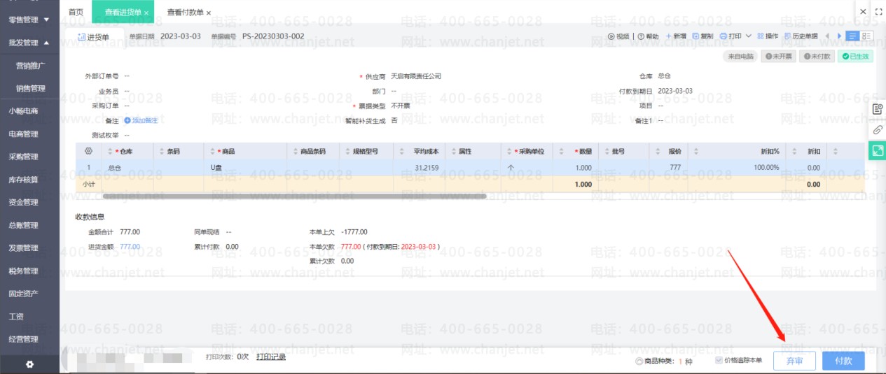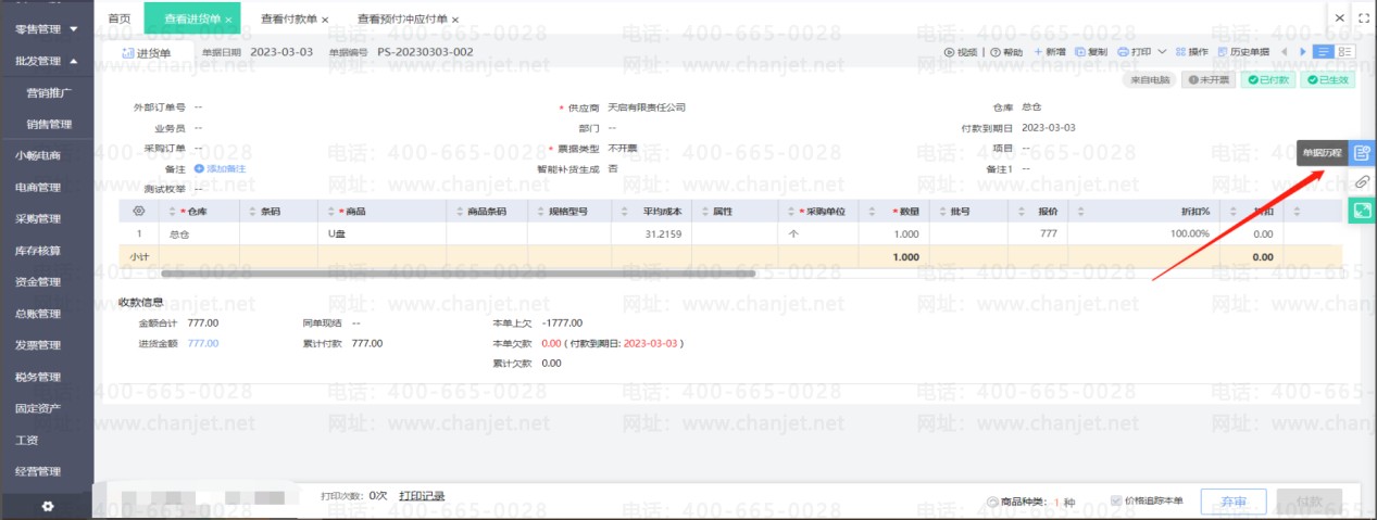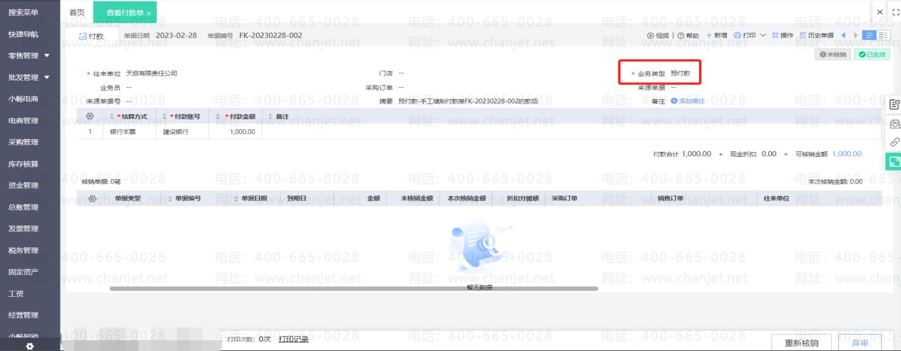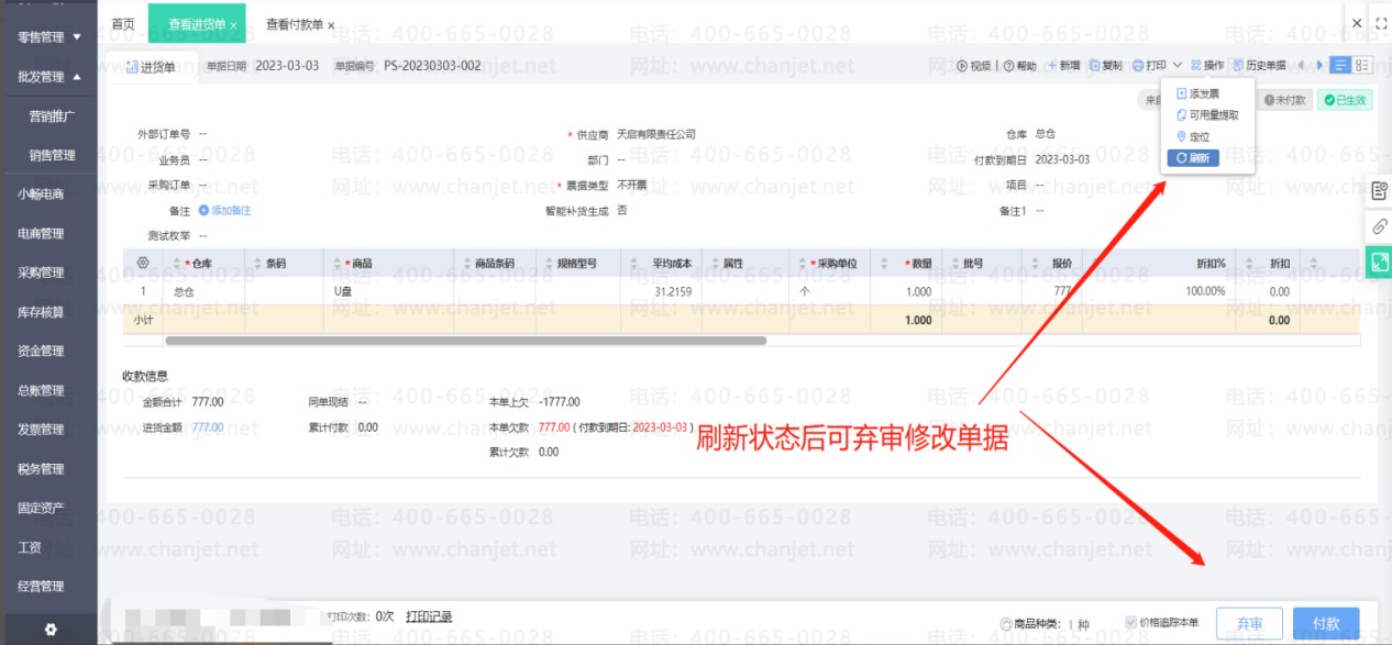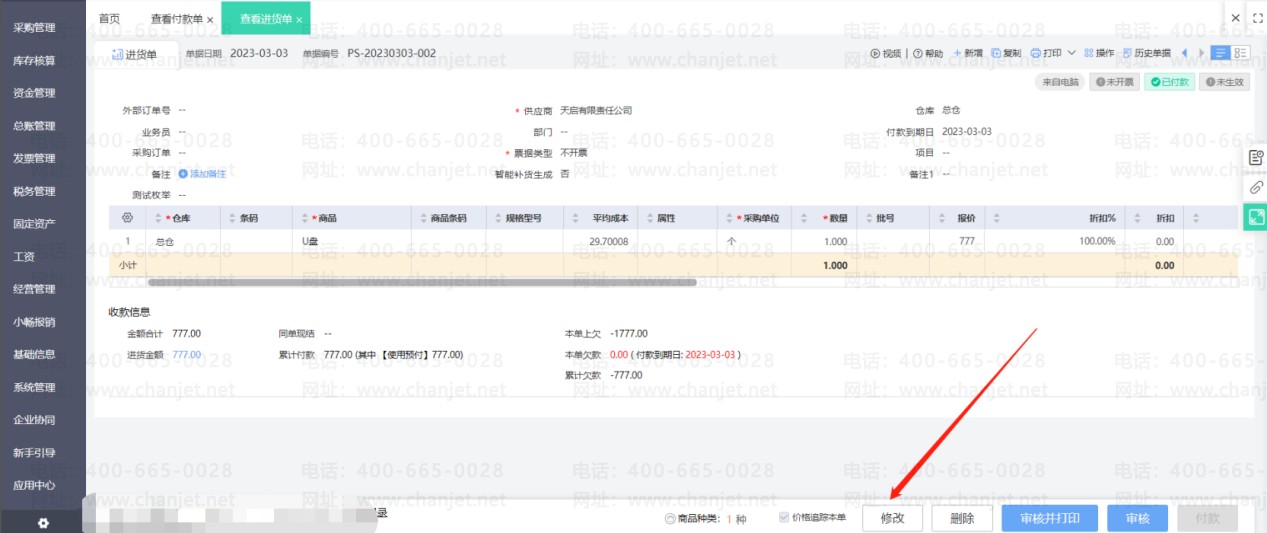点击修改进货单(如果进货单有审核步骤要先弃审再修改),然后取消使用预付款的勾选,重新保存进货单后即可取消核销。然后刷新预付款单状态就可以修改单据了。