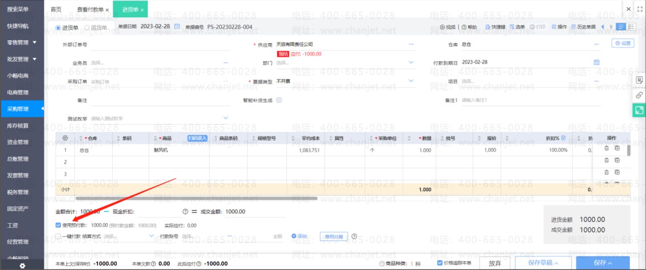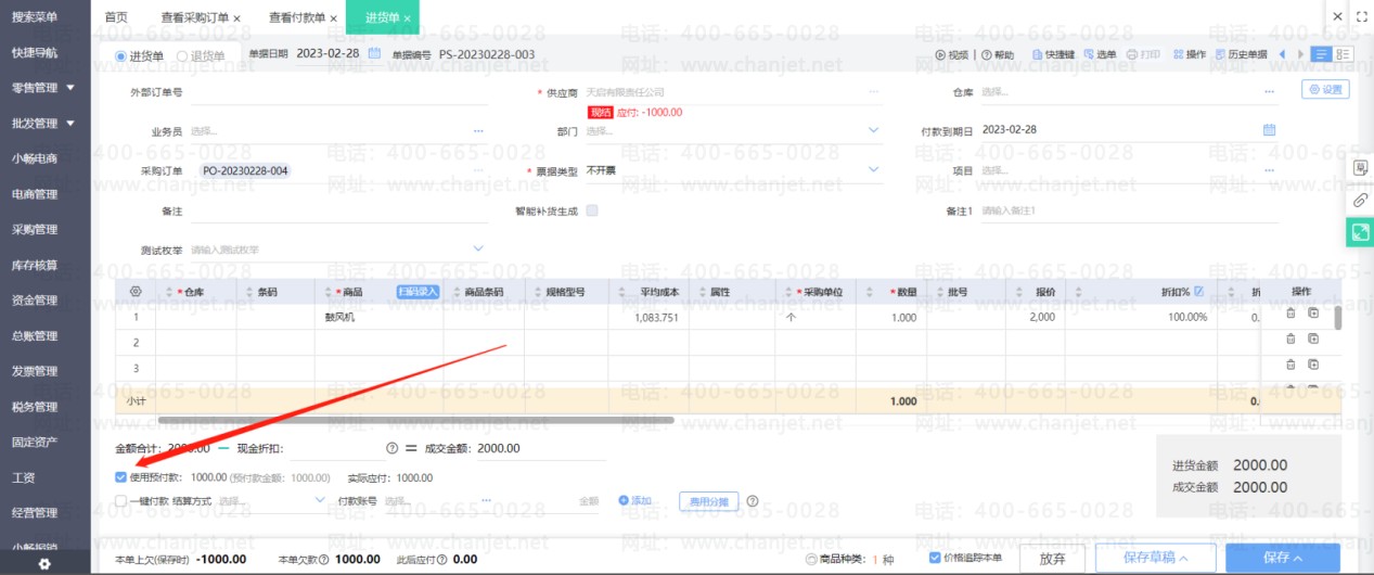 在进货单上勾选使用预付款
