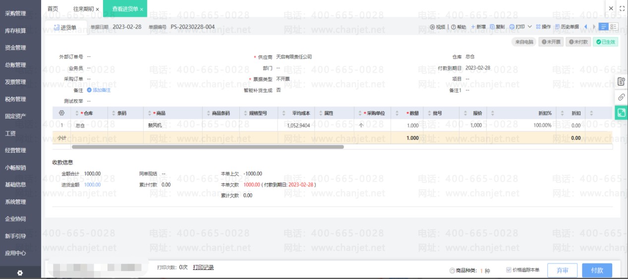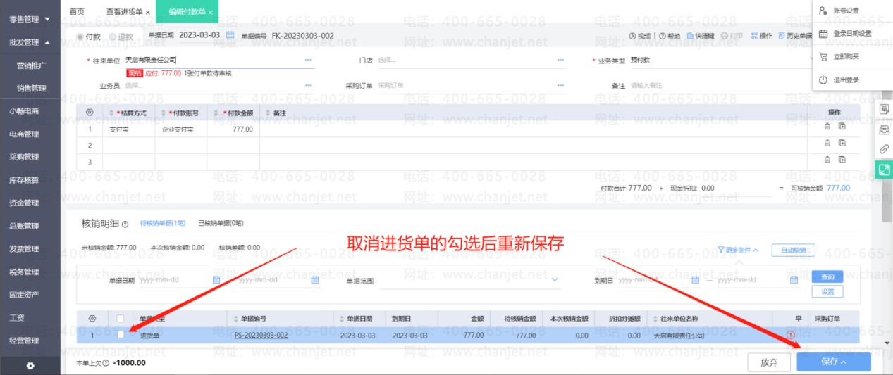 进货单上勾选使用了预付款之后,预付款单和进货单即核销。若之后发现预付款单需要修改一些内容,那么必须要先取消核销之后才能修改预付款单。