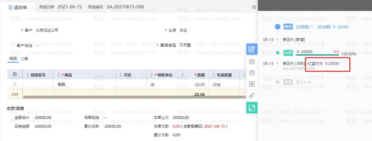 4.进入【批发管理】-【销售管理】-【销货单(历史)】,点击单据编号进入查看销货单或者销售退货单,右侧点击【单据历程】,可以联查到对应核销单据,并且上面会写明冲销方式【红蓝对冲】。并且进入销货单历史查看这两个单据累计收款金额一个是20000,一个是-20000。