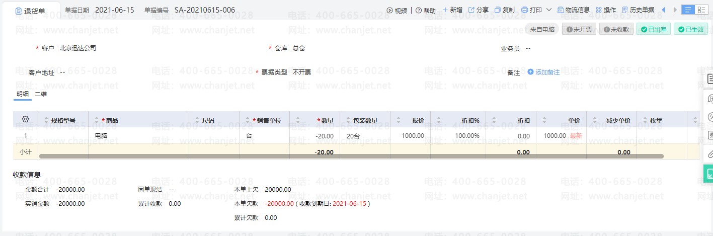 背景:6.15日,销售给北京迅达公司电脑20台,1000元/台,客户收到货之发现电脑死机,都没有办法开机使用,需要全部退回,并且我们没有收到客户货款。