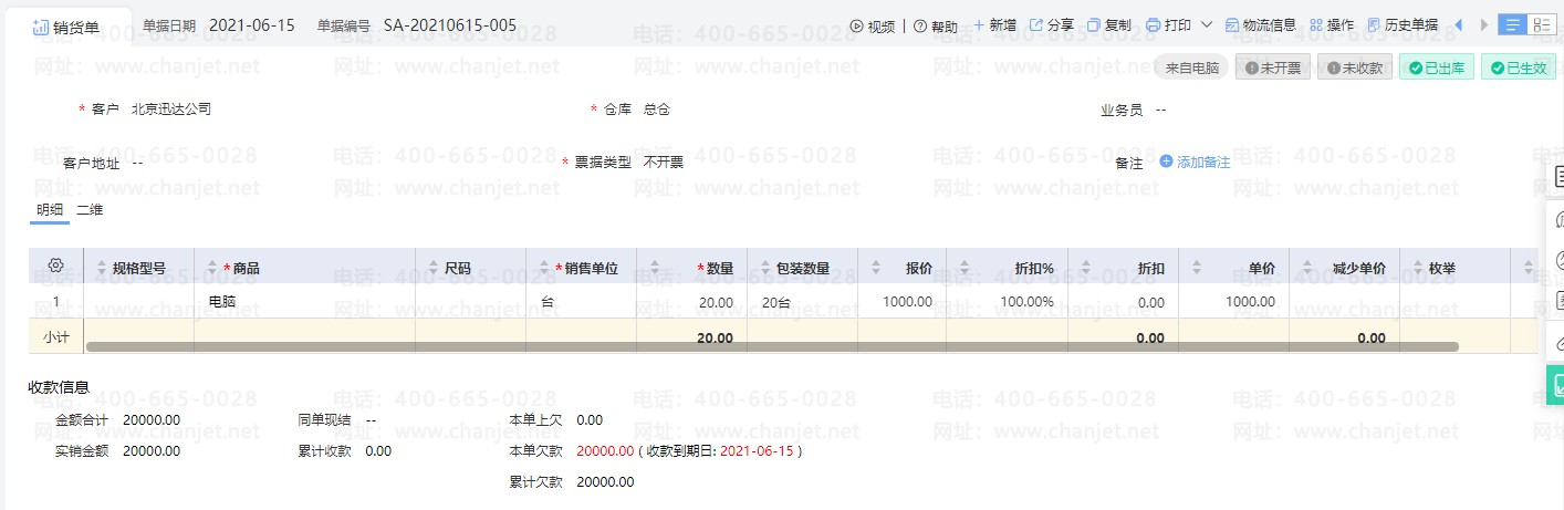 1.进入【批发管理】-【销售管理】-【销货单】,做一笔往来为北京迅达公司的销货单,如图: