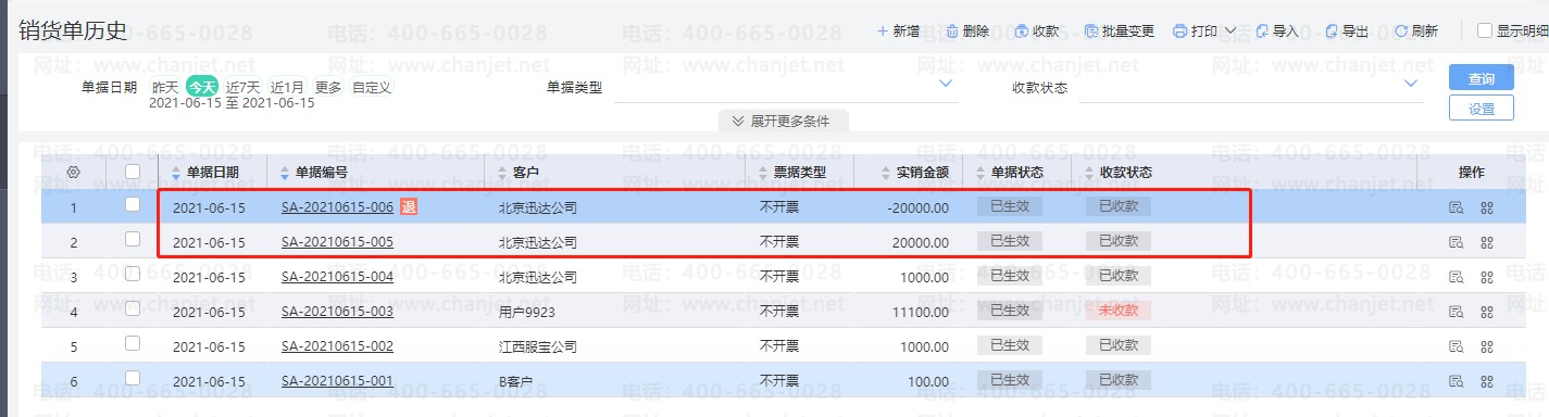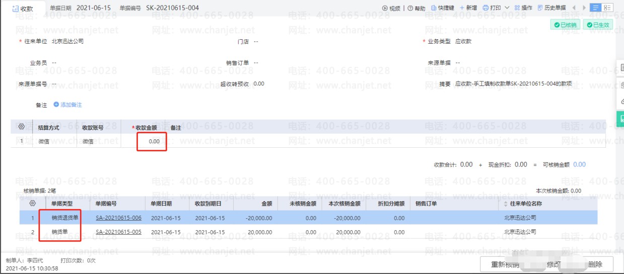 3.进入【资金管理】-【收款单】,做个收款金额为0,选到销货单跟销货退货单核销。
