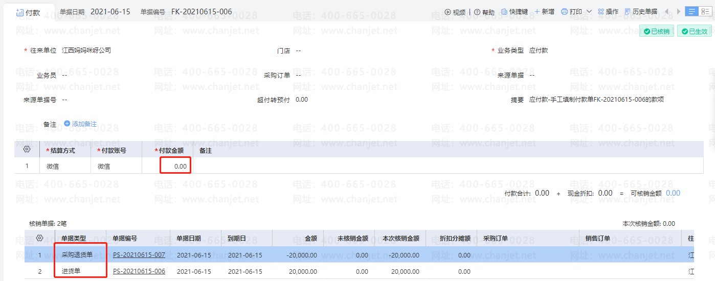 3.进入【资金管理】-【付款单】,做个付款金额为0,选到进货单跟进货退货单核销。