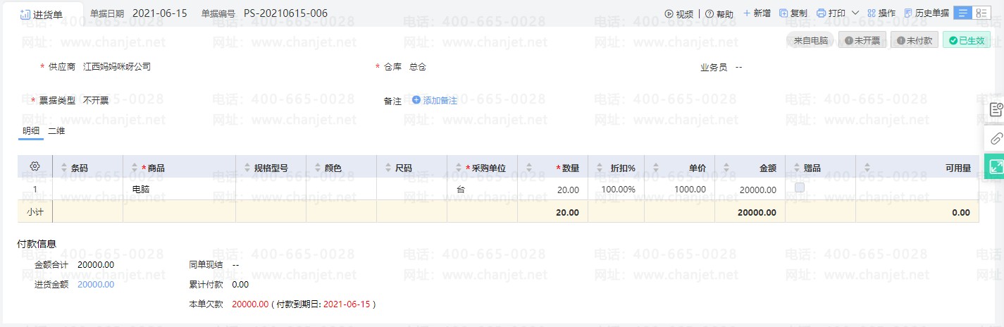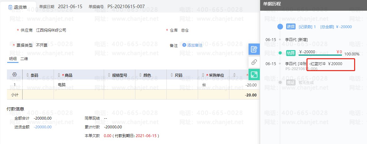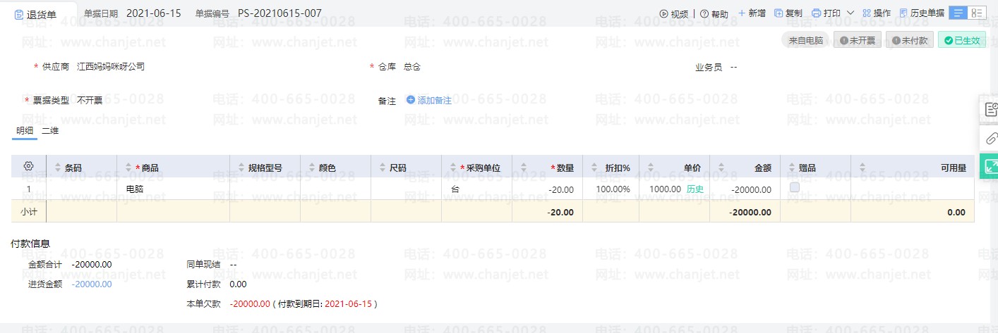 背景:6.15日,从江西妈妈咪呀公司采购电脑20台,1000元/台,采购回来发现电脑基本没有办法正常工作,需要全部退回,并且采购的时候没有支付这笔货款给到供应商直接退货。