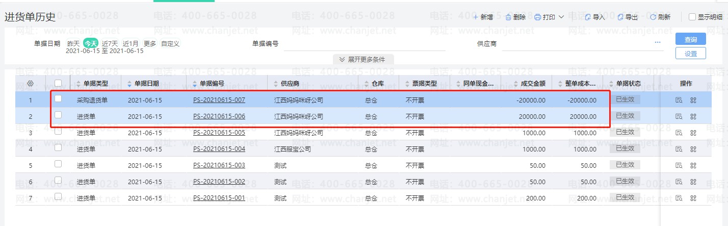2.退货给供应商,进入【采购管理】-【进货单】\【进货退货】做一笔往来为江西妈妈咪呀公司的红字进货单或者蓝字进货退货单。