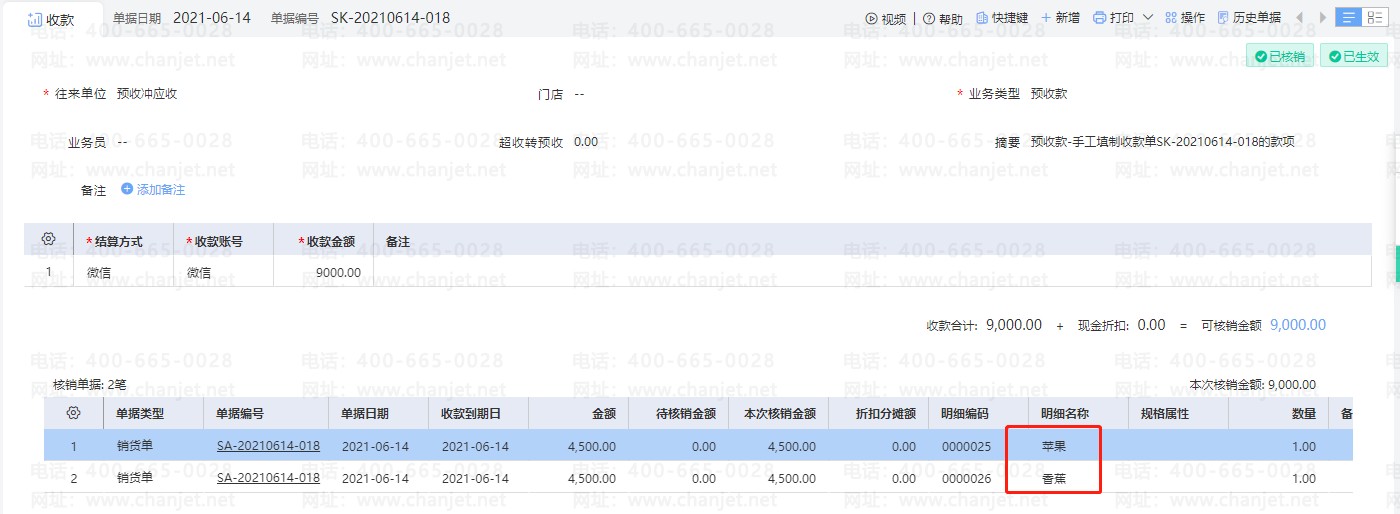 核销完毕之后,核销明细中可以显示具体的明细商品。