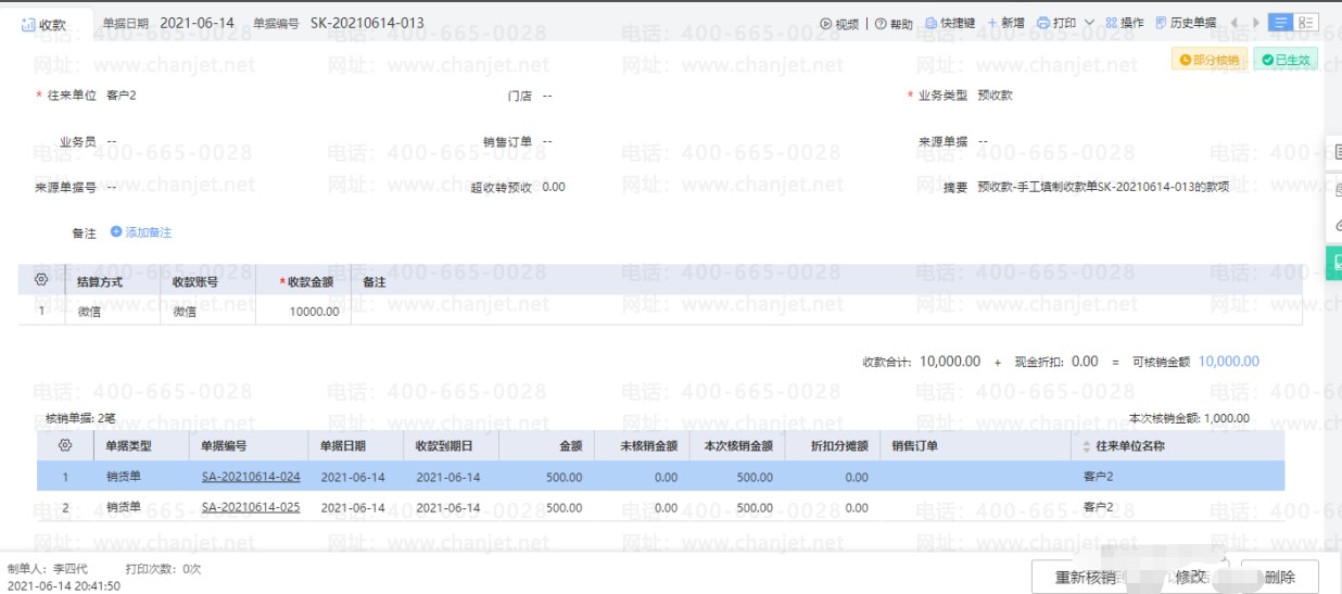 7.单据保存成功之后,单据右上角会显示单据的状态是全部核销还是部分核销。部分核销表示这张预收款单还有余额未核销掉,后续还能继续进行核销。后续核销重新打开预收款单点击重新核销即可。