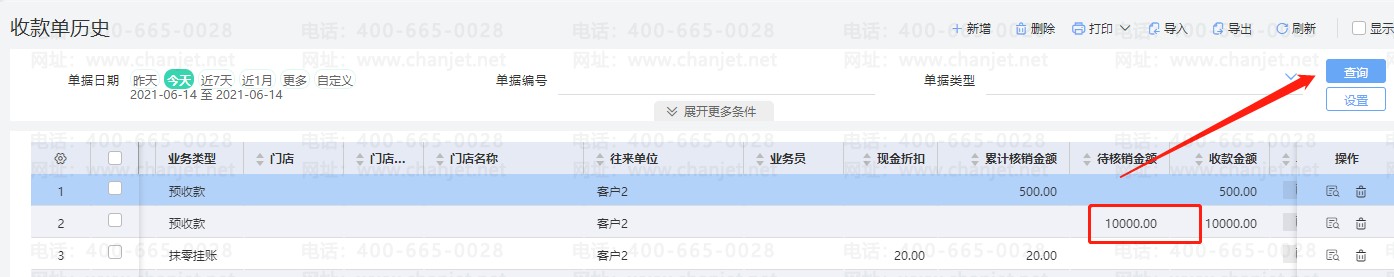 4.点击查询按钮,过滤出之前填制的预收款单。