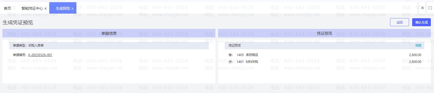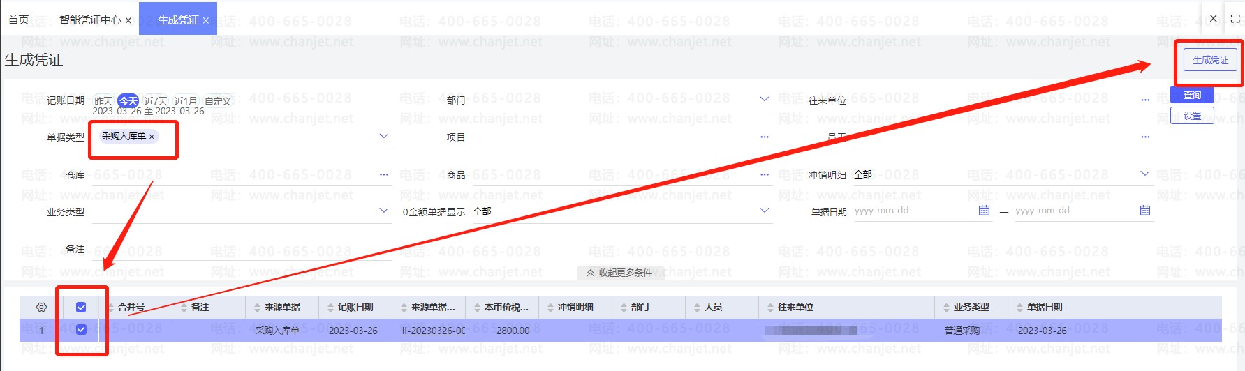 依次点击【总账管理】-【智能凭证中心】-【业务单据生成的凭证】点击【去生成】,单据类型找到采购入库单,勾选相应的单据之后点击【生成凭证】即可: