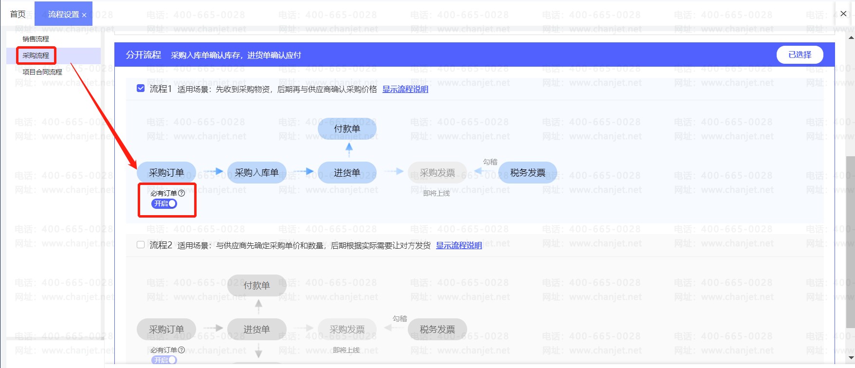 点击【系统管理】-【流程设置】找到【采购流程】,先选择适合自己的流程之后,找到【必有订单】,点击【开启】: